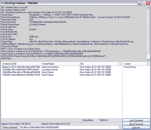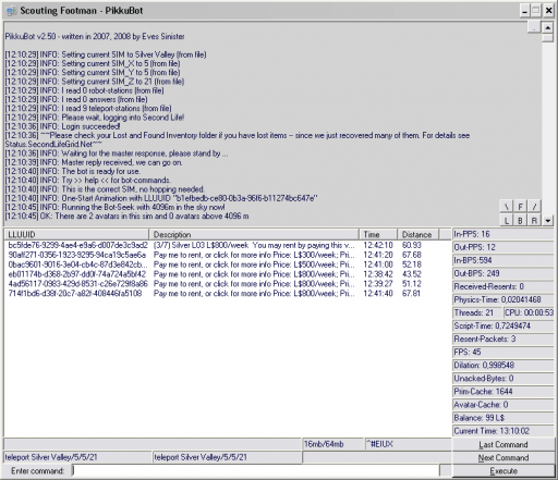PikkuBot Login Screen The PikkuBot GUI is showing you the current sim map with all avatars The PikkuBot GUI is showing you the whitelist and the chatter window The PikkuBot GUI is showing you the found prims The PikkuBot GUI is showing you the search window